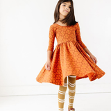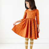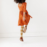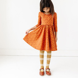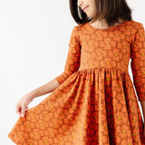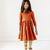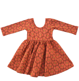 Beautiful orange, flower dress. Three-fourths quarter sleeve dress with soft, stretchy, durable fabric that'll last through play time and be comfortable enough for nap time.