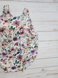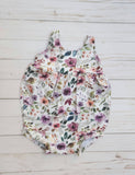 This delightful bubble romper boasts a snug fitted bodice adorned with a captivating floral print. Crafted from stretchy fabric, it effortlessly slips on and off without the need for snaps. Ideal for all-day comfort throughout spring and summer, it transitions seamlessly into fall and winter with the addition of tights and a leotard. Rest assured, it adheres to all CPSC guidelines for safety and peace of mind.