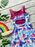 Your little girl will be pleased as punch wearing the Dino Rainbow dress! It will keep her snug and stylish with its grow-with-me design and fun rainbow and dino print in cheerful purple. It's the rainbow at the end of her wardrobe search!