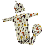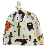 Calling all fantasy book lovers! This adorable newborn gown and hat set features a unique design with dragons, books, and swords.