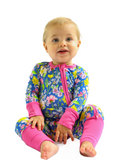 Adorable wildflower print zip romper. OEKO-TEX® STANDARD 100 certified modal. Double zip for easier diaper changes. Each piece is unique; print placement may vary. To avoid toxic chemicals, this fabric is not treated and is not flame-retardant. Wear tight-fitting and keep babies away from fire.