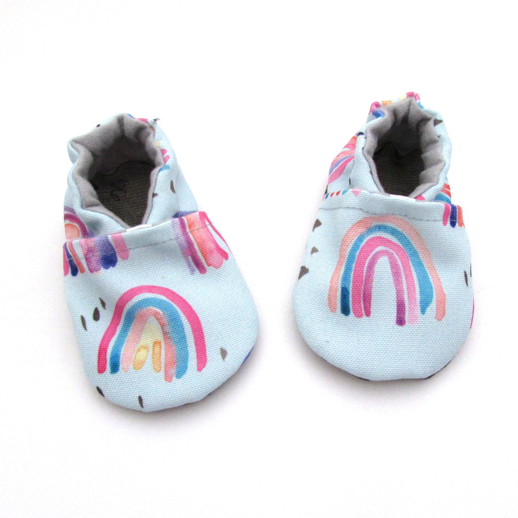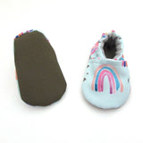 Sweet rainbow shoes. The rubber sole is very soft yet has enough traction for new walkers. The fact that there's no right or left shoe makes dress time fast and easy.