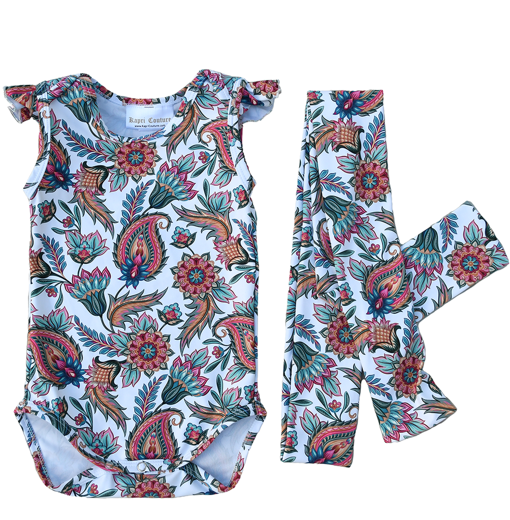 Make a splash with the Magical Maven Set! Perfect for little girls, this adorable outfit has it all--a baby onsie with a floral design, and a matching head wrap that can be used as a playsuit or swimming suit that's sure to turn heads. Get ready to make waves!