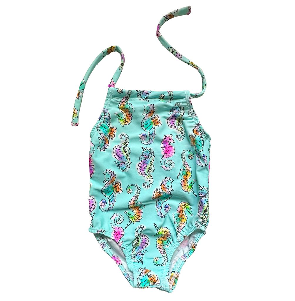 Make waves this summer with the Seahorse Suit! It's the perfect summer fit for your little one-- tailored with seahorse detail and made of lightweight teal fabric, they'll be ready to kick off their beach adventures in style!